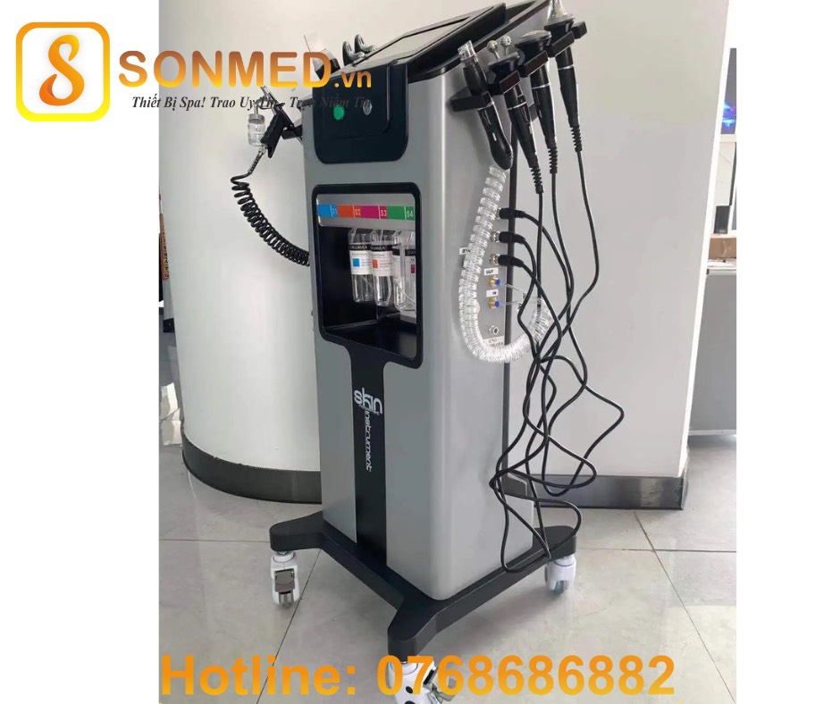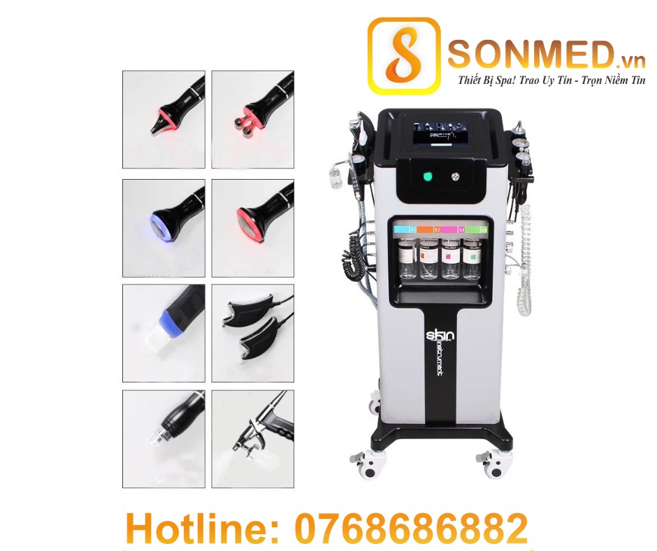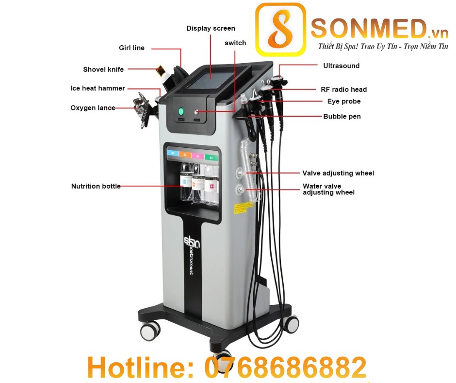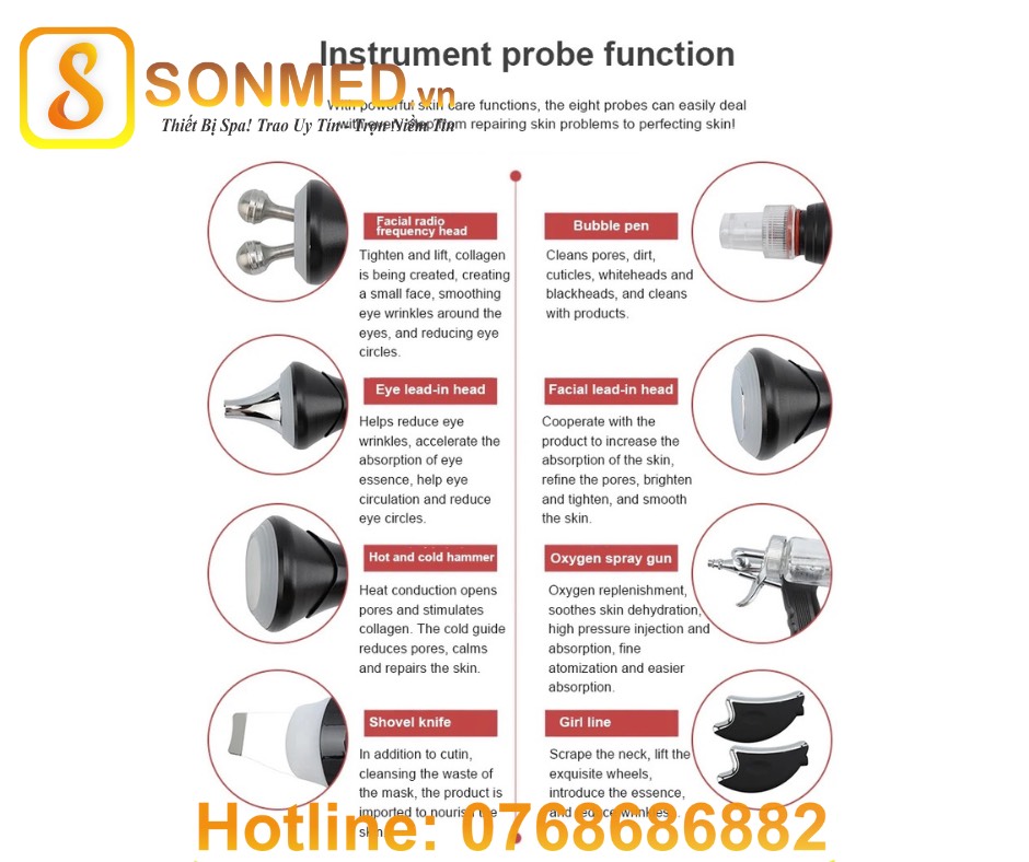 • Được trang bị 8 tay cầm: cold warm hammer, hydra peeling handle, ultrasonic skin scrubber, eyes ultrasound, face ultrasound, eyes rf, oxygen spray mist gun, beuaty head