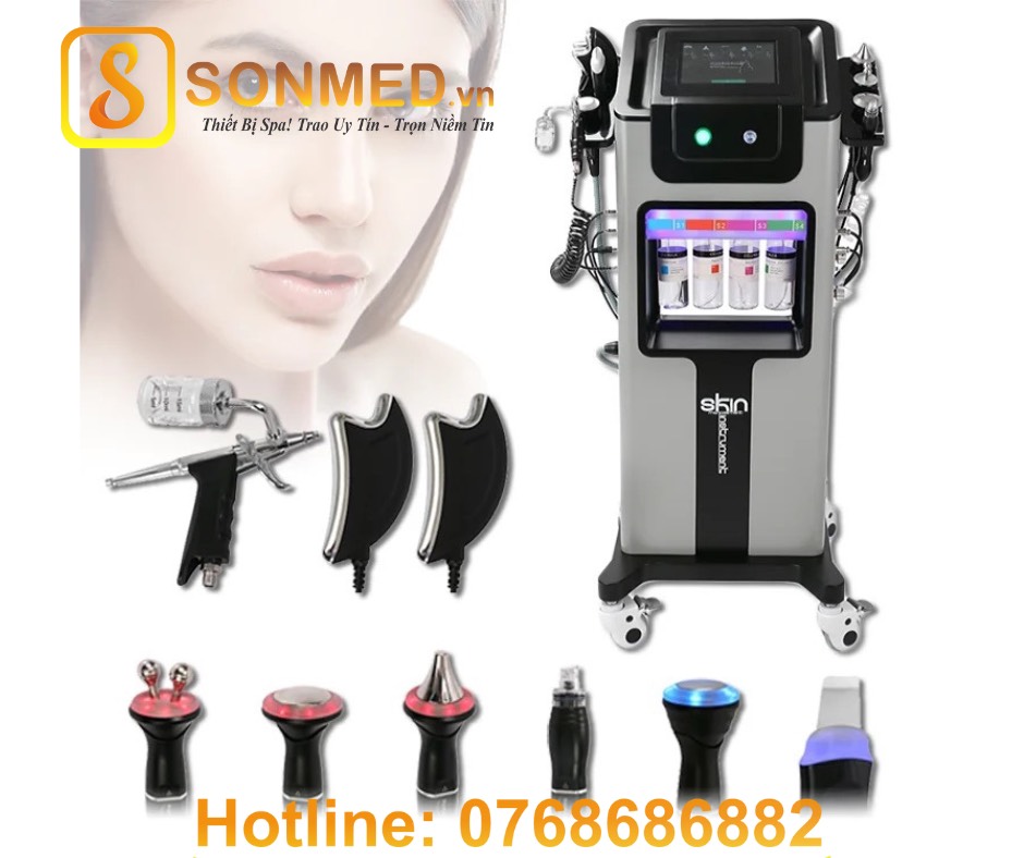 Máy chăm sóc da Skin instrument hiện đại nhất với 10 chức năng tích hợp trong cùng một thiết bị giúp bạn không cần đầu tư nhiều máy nhưng vẫn thực hiện được khá nhiều liệu trình chăm sóc da. Máy có các công dụng phổ biến như loại bỏ tế bào chết làm sạch sâu, cân bằng độ PH, oxy cung cấp dưỡng chất, loại bỏ nếp nhăn mắt hiệu quả… Điểm đặc biệt ở chiếc máy chăm sóc da đa năng này là có thêm đầu massage giúp xua tan mệt mỏi và mang đến cảm giác thư thái cho làn da.